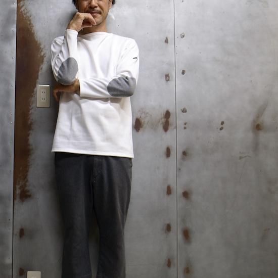 コットン100%、目のしっかりとした素材は、洗濯機でガンガン洗っても大丈夫。着込んでいくことによって、だんだんと風合いも出て、肌に気持ちよくなじんでいきます。エルボーパッチがスポーティーなアクセントになっています。