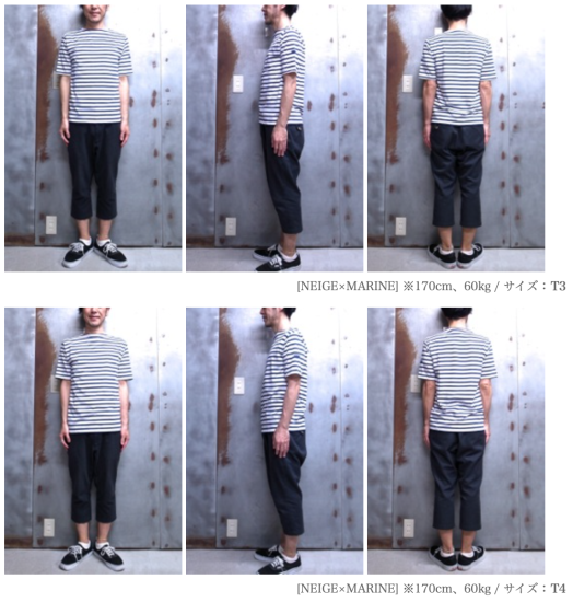 [サイズT4]を着用しますと少しリラックスなフィット感。洗って縮むと大き過ぎない程良いゆとり。しかしながら柔らかいドレープ感の出る素材感がピリアック素材の魅力なので、僕に程良いサイズ感はこちらですね。